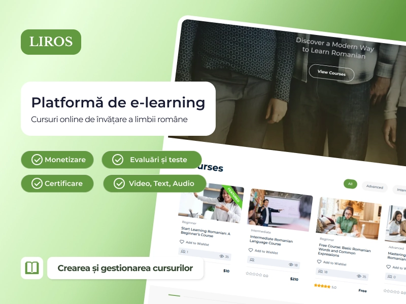 dezvolt platforme eLearning complete, ușor de folosit, cu cursuri online, teste, certificate și plată integrată, tot ce ai nevoie pentru a preda și vinde cursuri cu succes